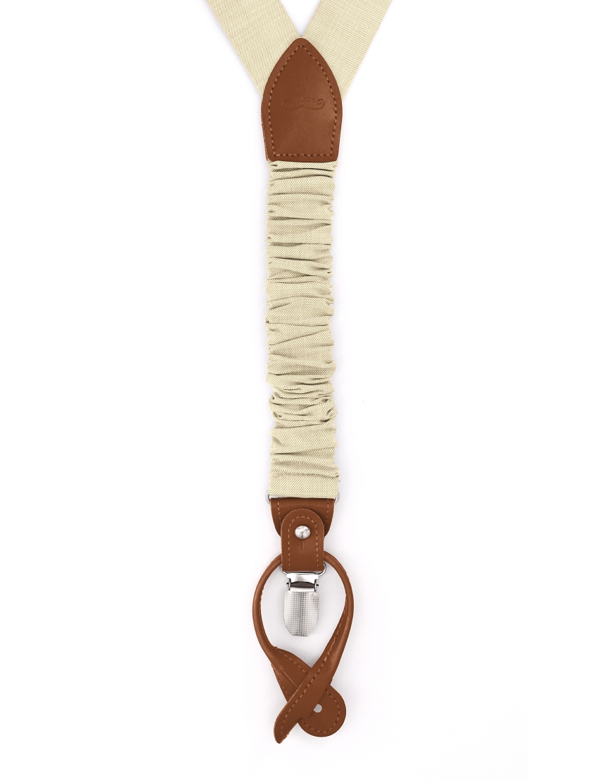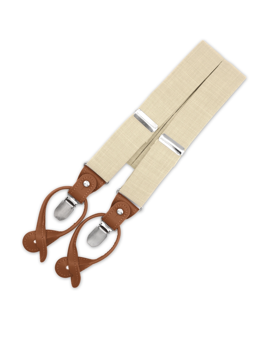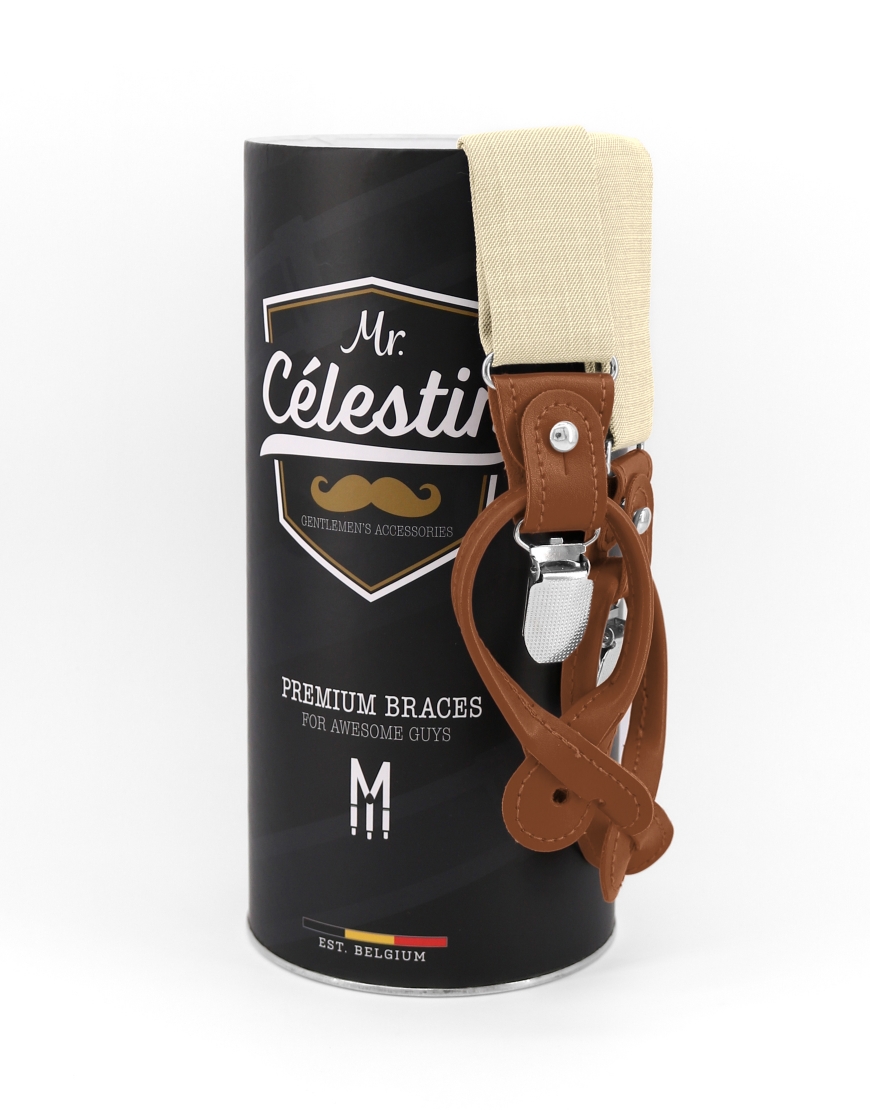 The Crema Tessaro® braces by Mr. Célestin stand out with their elegant light beige tone, easy to pair with any outfit. Handmade with Respect Leather™ vegan leather finishes (cognac brown), they strike the perfect balance between comfort and style. Ideal as wedding braces for men, formal braces or for special occasions, they are also refined enough for the office.